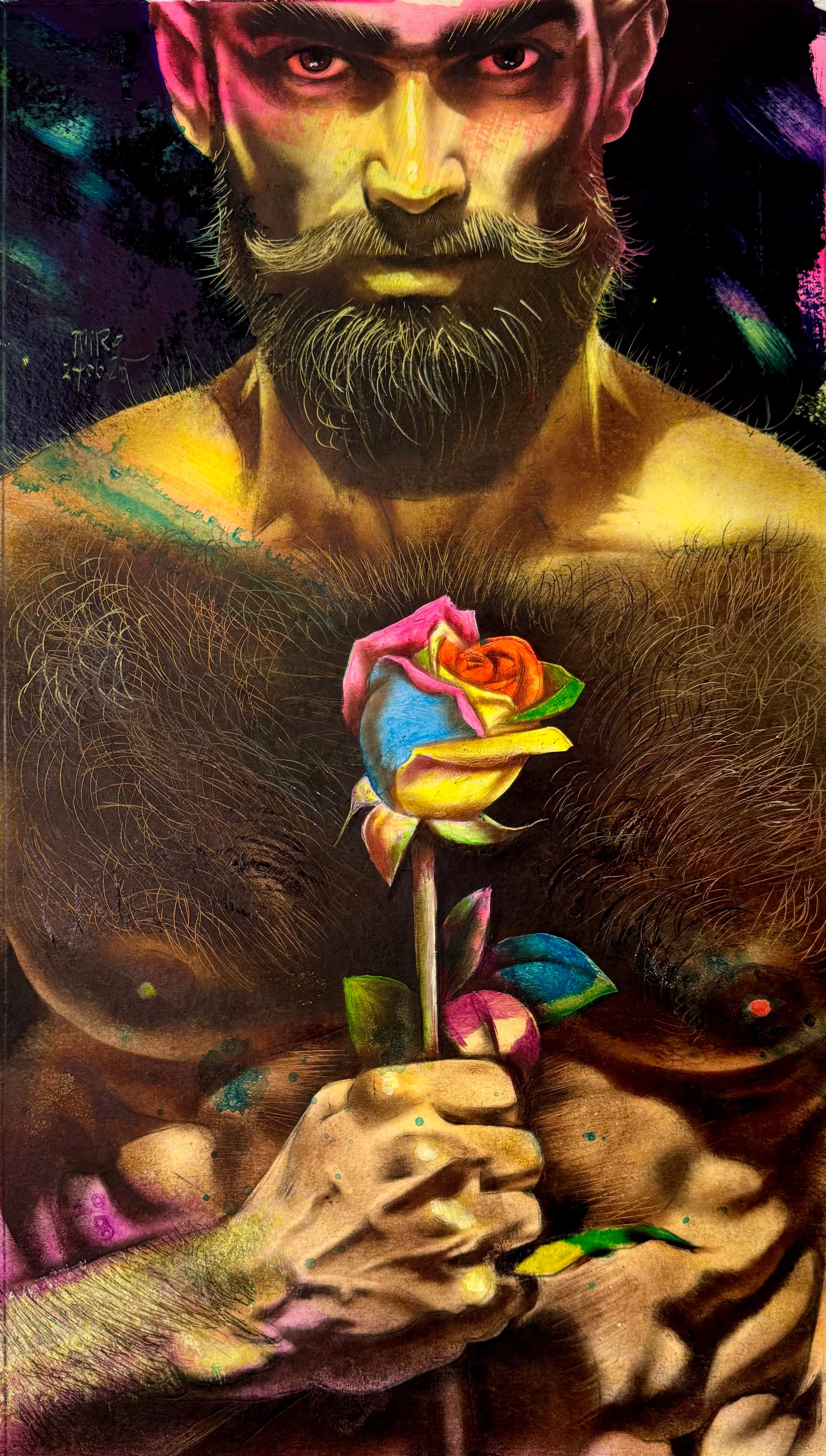 This piece captures the powerful contrast between masculinity and vulnerability — a tender rose blooming amidst strength, fur, and shadows.
